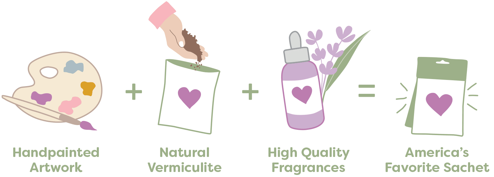 Our scented sachets are artwork-wrapped envelopes filled with fragrance oils and vermiculite, sort of like fancy dirt. The special paper diffuses the fragrance over the course of about 9 months.